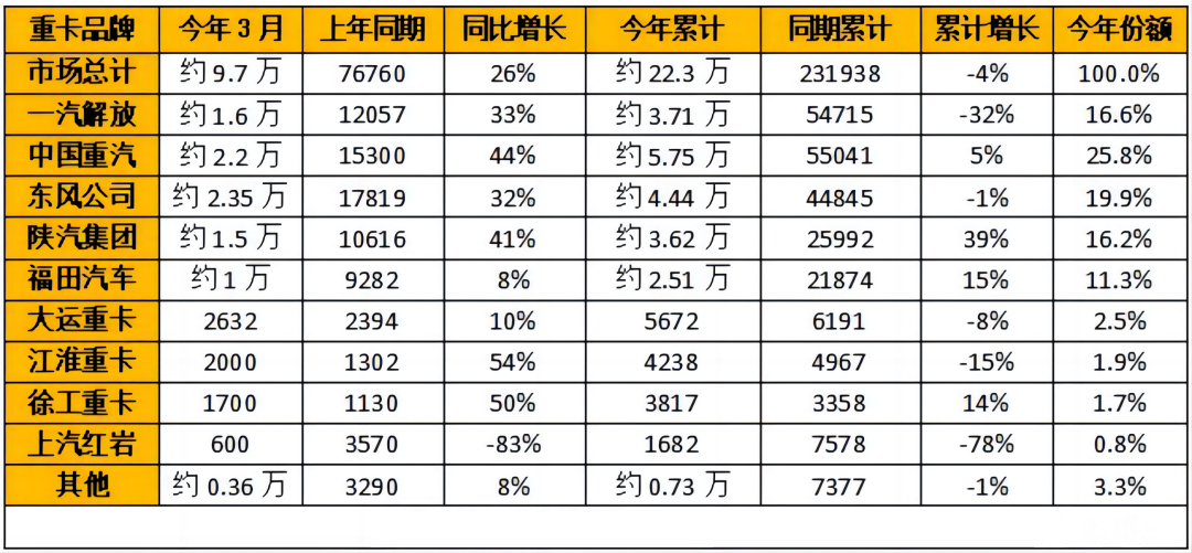 2023年3月,重卡市場實(shí)現(xiàn)了第二個(gè)月的連續(xù)上漲,同比漲幅達(dá)26%。奮戰(zhàn)在市場一線的重卡車企們表現(xiàn)如何?讓我們根據(jù)數(shù)據(jù)了解一下!