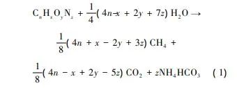 沼渣基本性質(zhì)包括pH、有機(jī)質(zhì)含量、含水率、碳/氮比(C/N)。易生物降解有機(jī)物(CnHxOyNz)厭氧消化過程中的分解反應(yīng)可用式(1)表示: