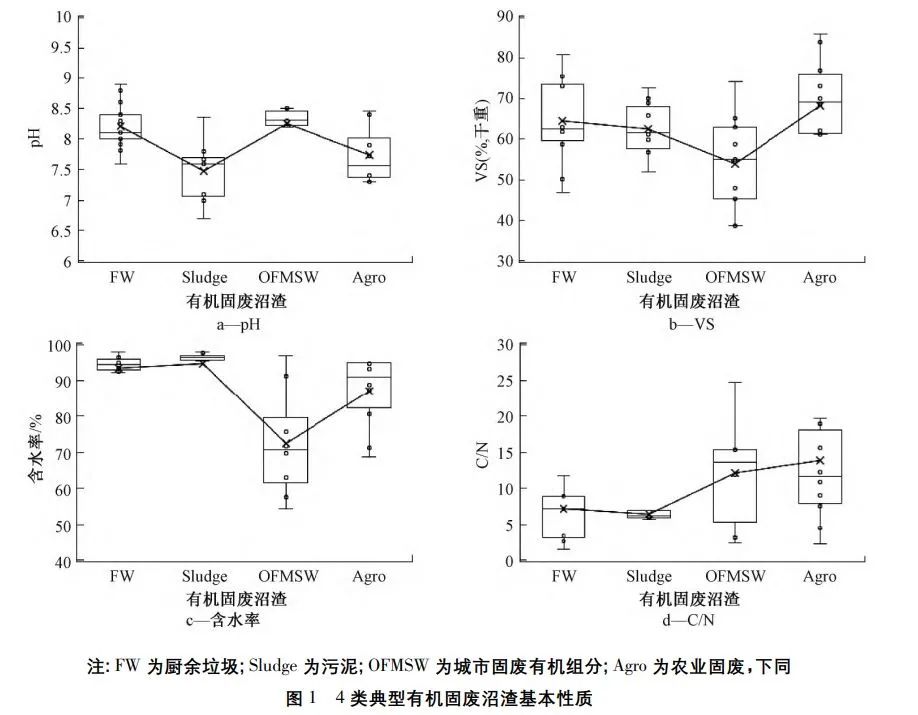 本文通過文獻(xiàn)調(diào)研與項(xiàng)目采樣,共統(tǒng)計(jì)了238個(gè)全球正式運(yùn)營(yíng)的大中型厭氧處理廠(處理量>50t/d)數(shù)據(jù),針對(duì)廚余、市政污泥、農(nóng)業(yè)固廢、與城市固廢有機(jī)組分4類典型進(jìn)料物的沼渣,分析其基本性質(zhì)、營(yíng)養(yǎng)物及重金屬含量并進(jìn)行對(duì)比。在調(diào)研中,廚余沼渣部分?jǐn)?shù)據(jù)來自文獻(xiàn)[8-16],市政污泥的沼渣部分?jǐn)?shù)據(jù)來自文獻(xiàn)[9,17-25],農(nóng)業(yè)固廢的沼渣部分?jǐn)?shù)據(jù)來自文獻(xiàn)[12,13,16-30],城市固廢有機(jī)組分的沼渣部分?jǐn)?shù)據(jù)來自文獻(xiàn)[9,25,31-35],另外,將實(shí)際運(yùn)營(yíng)的有機(jī)固廢厭氧處理廠的采樣分析作為各類沼渣數(shù)據(jù)的補(bǔ)充(此數(shù)據(jù)來自業(yè)界工程項(xiàng)目,未經(jīng)公開發(fā)表)。參考GB/T19095—2019《生活垃圾分類標(biāo)志》,本文中廚余(foodwaste,F(xiàn)W)表示易腐爛、含有機(jī)質(zhì)的經(jīng)分類后的生活垃圾,包括家庭廚余垃圾,餐廚垃圾和其他廚余垃圾;污泥(Sludge)特指城鎮(zhèn)污水處理廠在污水凈化過程中產(chǎn)生的市政污泥;農(nóng)業(yè)廢物(Agro)包括各類畜禽糞便與植物纖維性廢棄物2類;而城市固廢有機(jī)組分(organic fraction of municipal solid waste,OFMSW)包括庭院垃圾、雜草枯葉、花卉殘枝、家庭廚余與果蔬垃圾。本文分析了厭氧消化后未經(jīng)固液分離的沼渣,數(shù)據(jù)采用“平均值±標(biāo)準(zhǔn)方差”表示,標(biāo)準(zhǔn)方差越大,表示范圍分布越廣。