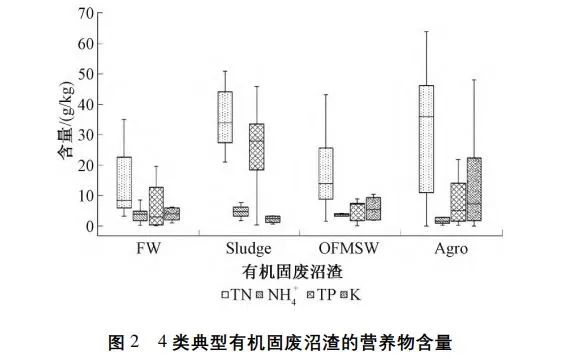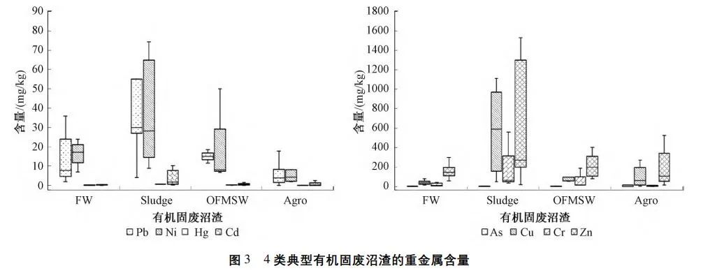 氮、磷、鉀是沼渣主要營(yíng)養(yǎng)物成分,是肥效作用的關(guān)鍵元素,而氨氮濃度可作為植物毒性與養(yǎng)分徑流的指標(biāo)。由圖2可知:4類沼渣營(yíng)養(yǎng)物含量具有明顯差異,廚余與城市固廢有機(jī)組分的沼渣總氮含量的平均值相近(18.5g/kg與18.2g/kg)且低于污泥與農(nóng)業(yè)固廢沼渣(32.9g/kg與35.7g/kg)。通常土壤氨氮控制目標(biāo)值為9.2g/kg,以避免氨氮植物毒性,而4類沼渣的氨氮濃度主要為3~5g/kg,引起植物毒性的可能性較小。污泥沼渣的總磷含量的平均值高達(dá)35.7g/kg,遠(yuǎn)高于廚余(6.6g/kg)、城市固廢有機(jī)組分(5.0g/kg)與農(nóng)業(yè)固廢(7.9g/kg),主要原因是市政污水中的磷富集在污泥中,厭氧消化過程中隨著微生物的分解衰減,超過80%(質(zhì)量分?jǐn)?shù))的生物結(jié)合磷被重新釋放到液相中,導(dǎo)致了污泥沼渣的較高的磷含量。而土壤的前端鉀肥施用導(dǎo)致末端農(nóng)業(yè)固廢沼渣的鉀含量較高(15.0g/kg),其平均值明顯高于其他種類沼渣(廚余沼渣:5.7g/kg;污泥沼渣:2.8g/kg;城市固廢有機(jī)組分:5.9g/kg)。基于以上歸納,若采用沼渣堆肥土地利用的技術(shù)路線,需考慮各類沼渣的主要養(yǎng)分(如通常污泥沼渣富含氮磷,農(nóng)業(yè)固廢沼渣富含鉀,而廚余與城市固廢有機(jī)組分的沼渣養(yǎng)分含量較為均衡),因地制宜地施用沼渣堆肥后的產(chǎn)品。