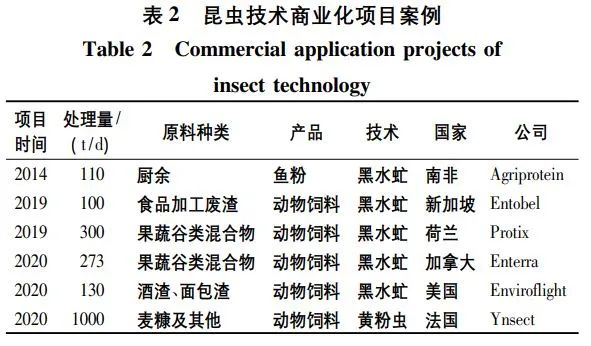 有機(jī)固廢沼渣富含大量營(yíng)養(yǎng)物質(zhì),具備資源化潛質(zhì)。昆蟲轉(zhuǎn)化技術(shù)作為近幾年的新興技術(shù),將有機(jī)固廢轉(zhuǎn)化生產(chǎn)高價(jià)值產(chǎn)品,實(shí)現(xiàn)全鏈條資源化(圖4c)。例如,黑水虻將有機(jī)固廢作為食物,在體內(nèi)消化并合成高含量的粗蛋白(40%干重)與粗油脂(30%干重),具有較高的商業(yè)價(jià)值。但就昆蟲轉(zhuǎn)化而言,物料的選擇是成功的關(guān)鍵環(huán)節(jié)。當(dāng)污泥沼渣作原料時(shí),黑水虻需要漫長(zhǎng)的時(shí)間進(jìn)行生物轉(zhuǎn)化(40d),遠(yuǎn)長(zhǎng)于果蔬垃圾為原料的轉(zhuǎn)化時(shí)間(10d)。除Agriprotein公司利用廚余為原料之外,其他公司均以果蔬、谷類、食品加工廢渣作為原料生產(chǎn)動(dòng)物飼料(表2)。此外,國際昆蟲食品飼料協(xié)會(huì)(International Platform of Insects for Food and Feed,IPIFF)將餐飲垃圾、畜禽糞便、含魚肉類食品列為昆蟲轉(zhuǎn)化技術(shù)的禁用原料。而加工類廢渣如麩皮、麥糠、酒渣、奶渣、果蔬垃圾的源頭可溯相對(duì)“安全”,推薦采用昆蟲技術(shù)。目前,全球處理量最大的是法國Ynsect公司采用的黃粉蟲技術(shù),每天處理1000t麥糠及其他輔料,且昆蟲轉(zhuǎn)化工藝的末端殘?jiān)缓乘幔娓珊罂勺鳛橛袡C(jī)肥料或土壤改良劑使用。近些年,昆蟲技術(shù)在我國迅速發(fā)展,主要應(yīng)用于廚余垃圾三相分離后的有機(jī)固渣處理,然而如何實(shí)現(xiàn)機(jī)械化養(yǎng)殖與運(yùn)營(yíng)是昆蟲技術(shù)在我國發(fā)展的瓶頸(尤其是蟲卵、蟲糞、幼蟲的精準(zhǔn)篩分)。另外,鮮蟲或干蟲的消納渠道是決定昆蟲技術(shù)是否盈利的關(guān)鍵,根據(jù)Eawag在印度尼西亞的黑水虻生產(chǎn)測(cè)試線調(diào)研報(bào)告,相比養(yǎng)殖場(chǎng)飼料,將干蟲或鮮蟲作為家庭寵物飼料更為適合,更加利于建立全鏈條資源化產(chǎn)業(yè)鏈。