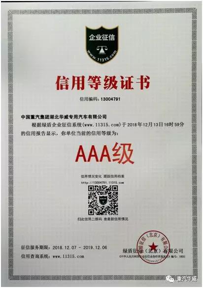 近日,經過綠盾征信(北京)有限公司第三方信用評價公司的嚴格審核,重汽集團湖北華威專用汽車有限公司榮獲“AAA級企業信用等級”證書,成為極少獲此殊榮的專汽制造企業之一,這標志著重汽華威在規范運營、誠信經營上得到了相關部門及權威機構的認可。