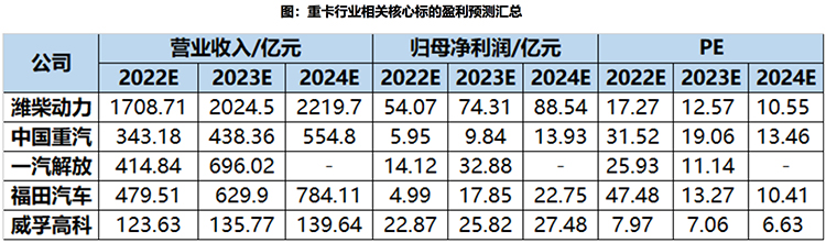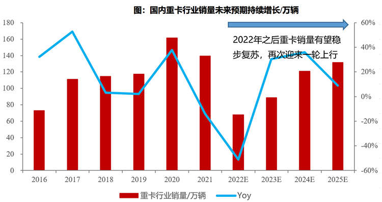 投資建議方面,東吳證券表示,2022年重卡銷量觸底,2023年保守預計雙位數正增長,布局點已至,銷量中樞2025年之前依 然穩定100萬輛左右。