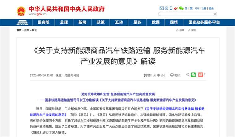 2023年1月30日,國家鐵路局、工業和信息化部、中國國家鐵路集團有限公司聯合印發《關于支持新能源商品汽車鐵路運輸 服務新能源汽車產業發展的意見》,其中提出積極鼓勵開展新能源商品汽車鐵路運輸業務,對納入工業和信息化部《道路機動車輛生產企業及產品公告》范圍(出口新能源商品汽車產品不受此限制),采用鋰離子電池驅動的插電式混合動力或純電動新能源商品汽車,依據《鐵路安全管理條例》《鐵路危險貨物運輸安全監督管理規定》《危險貨物品名表》(GB 12268)等法律法規和有關標準,鐵路運輸新能源商品汽車不按危險貨物管理,由承托雙方按照本通知要求辦理運輸。