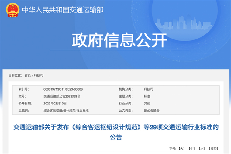 2月10日,交通運輸部發布《綜合客運樞紐設計規范》等29項交通運輸行業標準,其中包括針對綜合客運樞紐、公共管理電子證照、公共汽電車線網評價指標、營運車輛部分性能要求和檢測方法、汽車租賃管理服務信息系統、城市公共交通IC卡技術規范等多項標準。