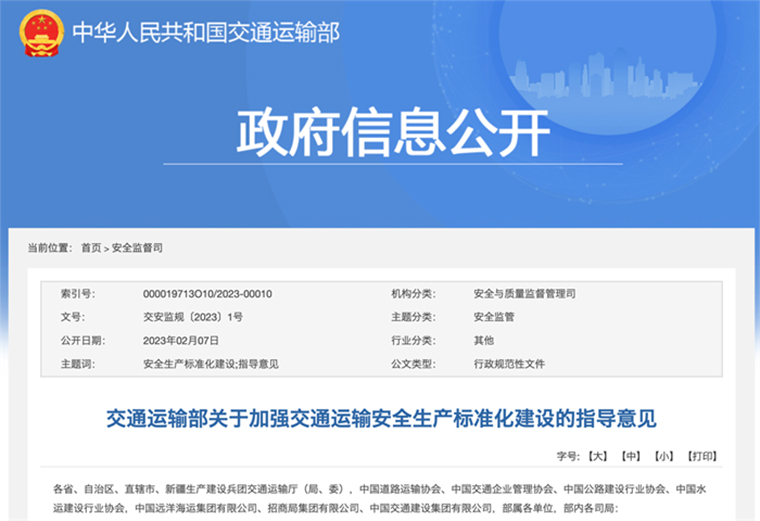 2月7日,交通運輸部印發《關于加強交通運輸安全生產標準化建設的指導意見》。意見》明確了堅持“企業為主、標準引領、依法監管、協同共治”的工作原則,依法落實企業法定職責,激發企業的主動性和積極性,加強行業監督服務,發揮安全生產標準化建設對安全管理水平提升的促進作用,推動社會力量協同共治。