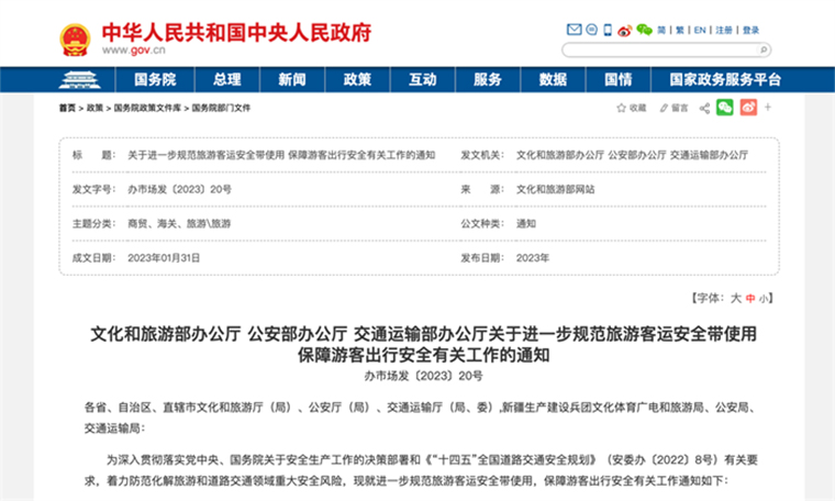 2月10日,文化和旅游部辦公廳、公安部辦公廳、交通運輸部辦公廳聯合印發《關于進一步規范旅游客運安全帶使用保障游客出行安全有關工作的通知》!锻ㄖ诽岢鑫鍌“嚴格”:嚴格安全帶使用合同約定;嚴格車輛安全帶技術狀況管理;嚴格安全帶使用提醒和檢查;嚴格安全帶使用執法檢查;嚴格事故倒查和曝光警示。