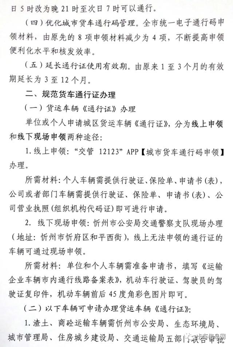 1.渣土、商砼運輸車輛需忻州市公安局、生態環境局、城市管理局、住房城鄉建設局、交通運輸局五部門聯合審批辦理通行證;