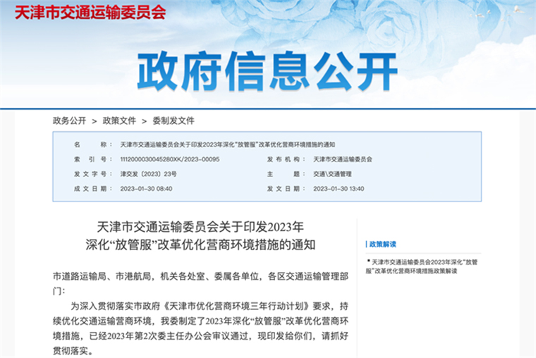 1月30日,天津市交通運輸委員會發布《關于印發2023年深化“放管服”改革優化營商環境措施的通知》。重點打造“交通運輸旗艦店”,在“津心辦”App“天津交通運輸旗艦店”中,開通交通運輸高頻政務服務事項辦理功能,全面提升交通運輸政務服務便利化水平。