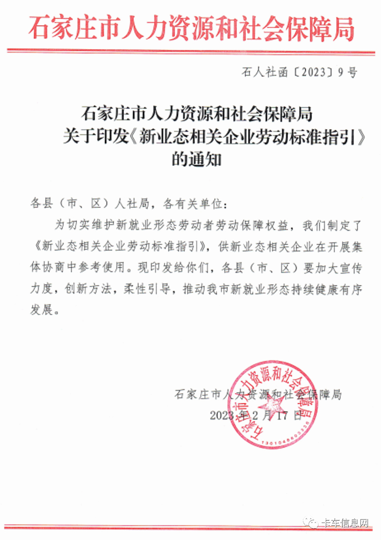 日前石家莊市人社局制定的《新業態相關企業勞動標準指引》明確規定,為切實維護和保障依托互聯網就業的貨車司機等新就業形態勞動者勞動保障權益,鼓勵新業態相關企業通過集體協商制定勞動標準!吨敢访鞔_要求: