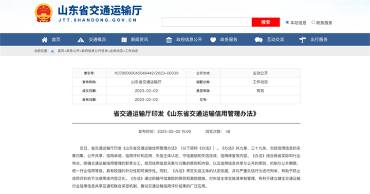 加強惡劣天氣等特殊情形下的勞動保護,采取限制接單、延長服務完成時限等措施,最大限度減少安全生產事故和職業病危害。 山東 差異化監管信用主體 2月2日,山東省交通運輸廳印發《山東省交通運輸信用管理辦法》。根據《辦法》,山東將交通運輸行業信用等級劃分為5個等級,對信用主體實行一年一次的定期評價,實施差異化分級分類監管。對于信用狀況良好的信用主體,山東省交通運輸主管部門將在行政審批和項目核準時,提供“綠色通道”“告知承諾”等簡化辦理、快速辦理的便利服務;在日常監督管理和專項檢查中,合理降低抽查比例、減少檢查頻次;對于嚴重失信行為主體,依法依規公開主體相關信息,依照有關失信懲戒措施清單采取相應措施。