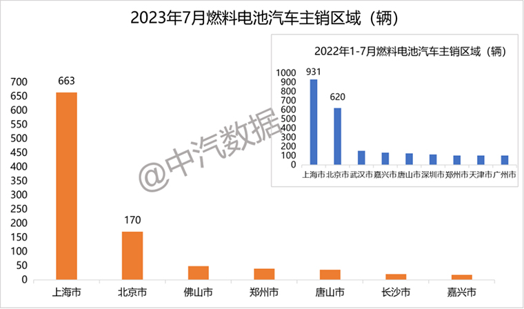從銷售區域來看,2023年7月,上海是國內燃料電池汽車市場的熱銷區域。以663輛的月銷量獨占鰲頭,占7月總銷量的65.8。 雖然7月基本保持和上半年相近的趨勢,以上海、北京、佛山等示范城市為主,但長沙、嘉興等非示范城市也在積極發力,推進燃料電池市場化進程。