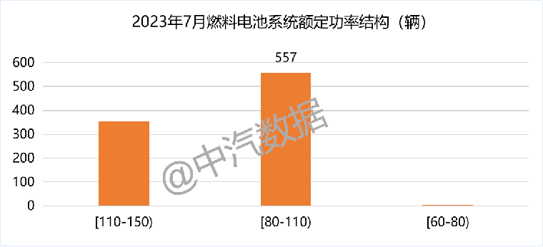 從燃料電池系統來看,燃料電池系統仍趨于大功率化,2023年7月,燃料電池系統額定功率以80-110kW為主,銷量配套量為557輛,占比超過7月全部系統配套量的一半。