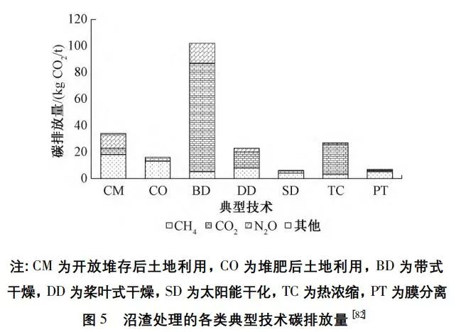 沼渣處理是一個(gè)排放CO2(eq)的過程,其能量消耗可通過二氧化碳當(dāng)量(CO2(eq))核算。不同處理手段的沼渣處理過程碳排放排序?yàn)椋簬礁稍?100kgCO2/t)>開放堆存利用(38kgCO2(eq)/t)>熱濃縮(24kgCO2(eq)/t)>槳葉式干燥(21kgCO2(eq)/t)>堆肥利用(18kgCO2(eq)/t)>膜分離(10kgCO2(eq)/t)>太陽能干化(6kgCO2(eq)/t)(圖5)。沼渣干化工藝的選擇影響著碳排放量:帶式干燥的耗電量大,且過程中大量的氮源流失,導(dǎo)致其土地利用價(jià)值較低、碳排放較大;而太陽能干化通過利用太陽能輻射轉(zhuǎn)化能量,極大減少了碳排放。若沼渣進(jìn)行土地利用,營(yíng)養(yǎng)物質(zhì)具備碳減排效益,沼渣代替肥料可實(shí)現(xiàn)碳補(bǔ)償-20~-28kgCO2(eq)/t。相比之下,沼渣焚燒的碳排放為95~100kgCO2(eq)/t。就新興資源化技術(shù)而言,昆蟲轉(zhuǎn)化工藝的碳排放較少(約30kgCO2(eq)/t),僅為焚燒工藝的30%,但針對(duì)沼渣的昆蟲轉(zhuǎn)化技術(shù)仍處在研究階段。尚無沼渣高值碳化(HTL)與生物干化過程的碳排放的研究報(bào)道。