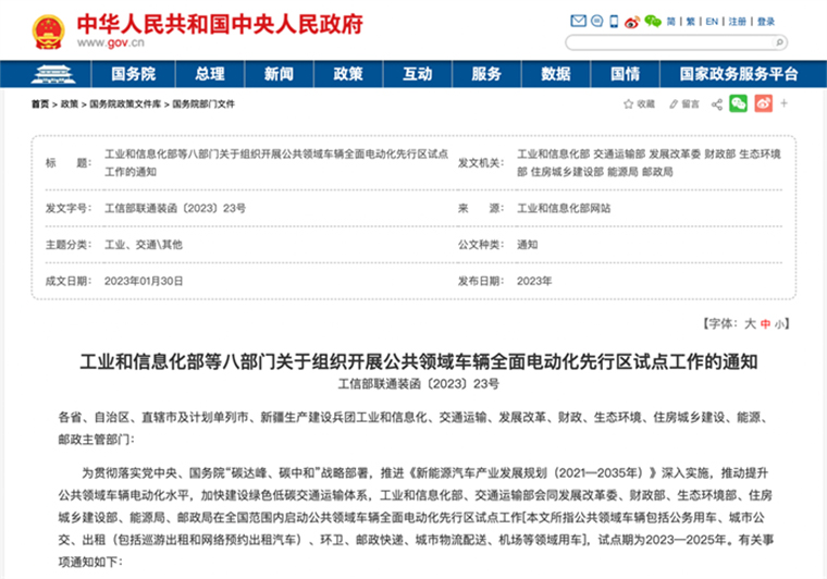 2月3日,工信部、交通運輸部會同國家發展改革委、財政部、生態環境部、住房城鄉建設部、國家能源局、國家郵政局印發通知,在全國范圍內啟動公共領域車輛全面電動化先行區試點,期限為2023年至2025年,明確提出試點領域新增及更新車輛中新能源汽車比例顯著提高,其中城市公交、出租、環衛、郵政快遞、城市物流配送領域力爭達到80%;新增公共充電樁(標準樁)與公共領域新能源汽車推廣數量(標準車)比例力爭達到1:1,高速公路服務區充電設施車位占比預期不低于小型停車位的10%。