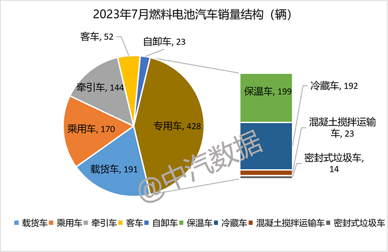 從車型方面,2023年7月,燃料電池汽車銷量以專用汽車為主,銷量共428輛,功能上主要以保溫車和冷藏車為主。其次是載貨車,銷量為191輛。